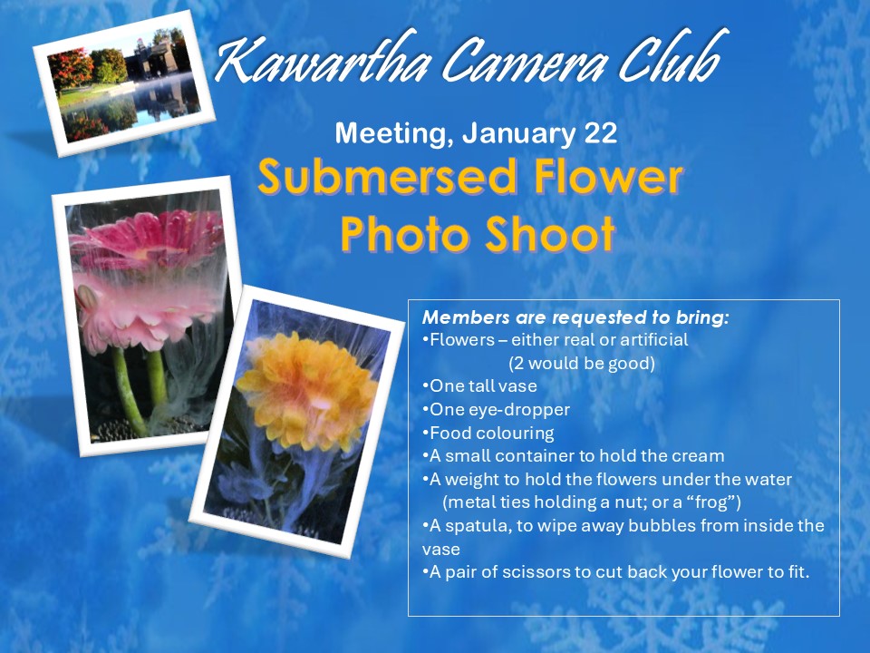 Start meeting with a short tutorial video table top photo shoot: Flowers in coloured water or milk. Members requested to bring flowers and a clear , plain vase. coffee |