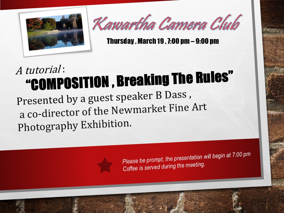 The meeting will have a guest speaker presenting a tutorial about “Composition and Breaking the Rules”. coffee