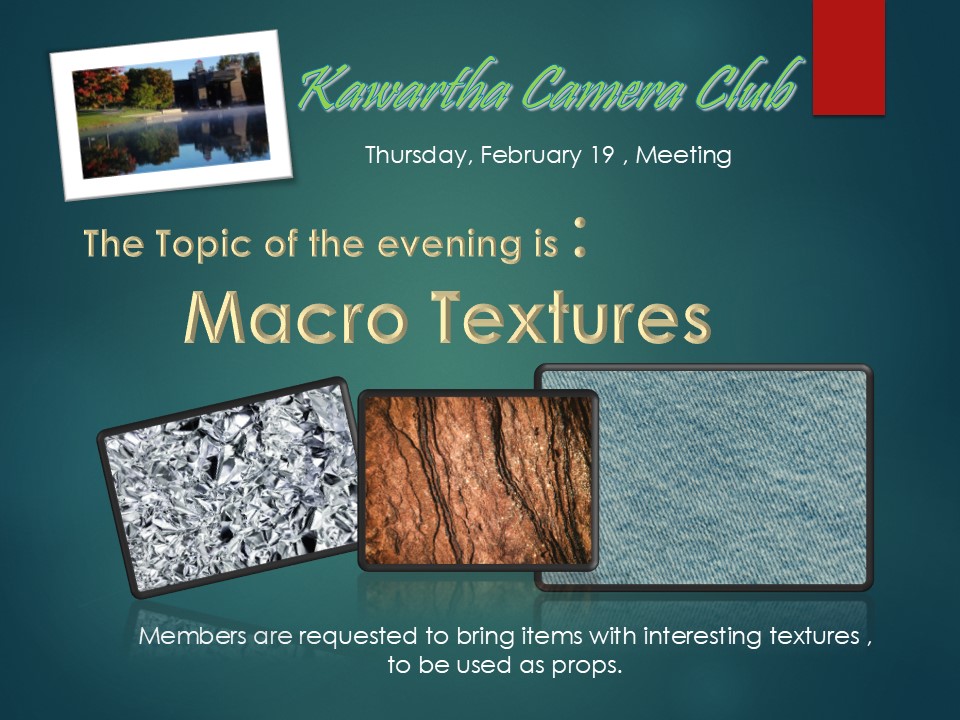 short tutorial video table top photo session: Macro Textures. Members are requested to bring textured objects to be used as props. coffee